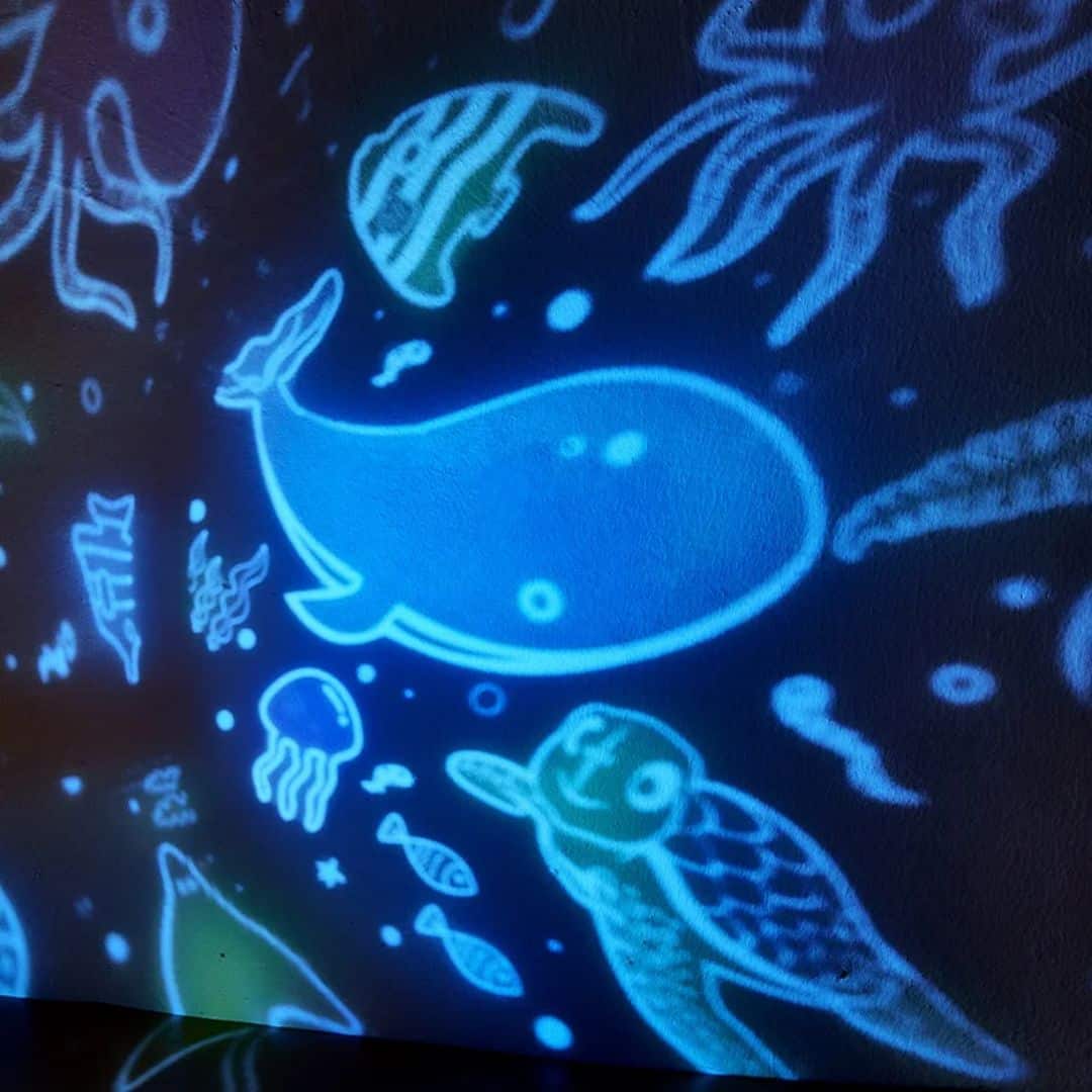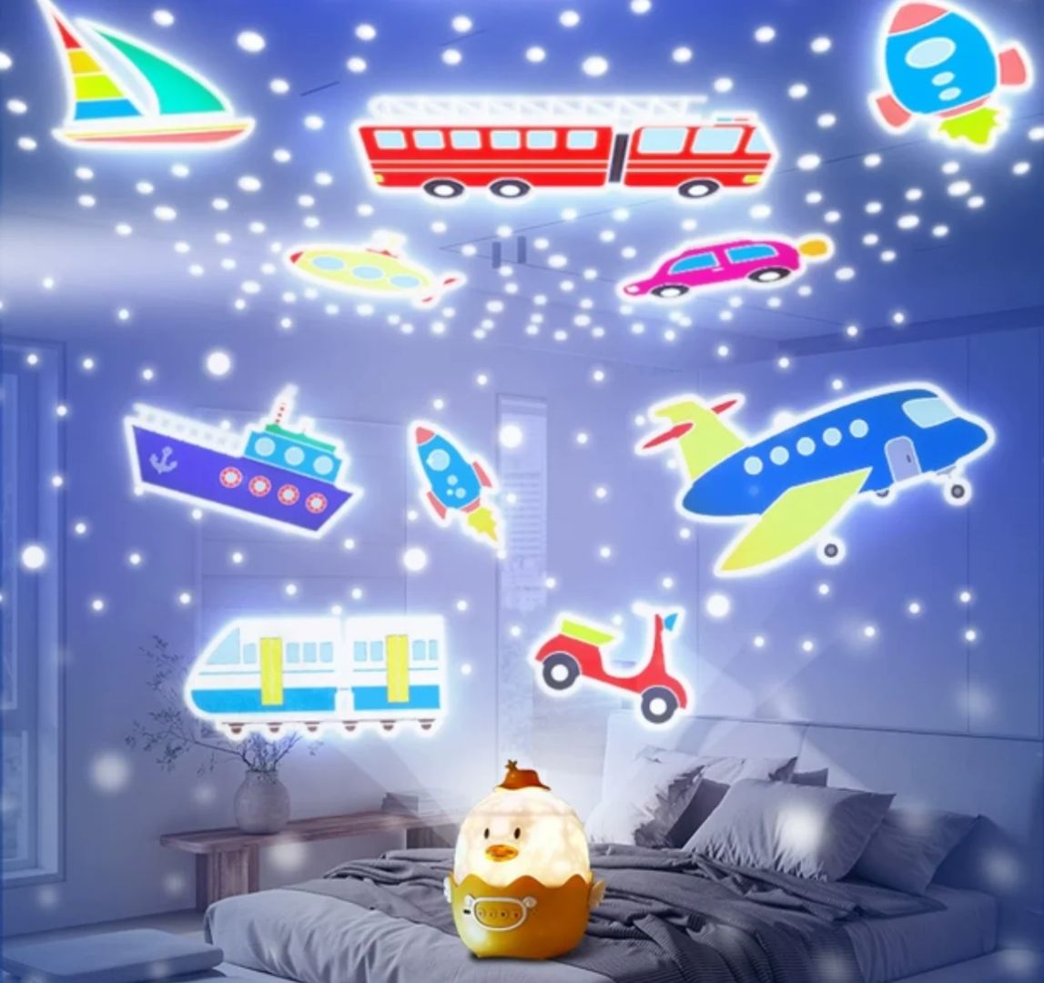 یکی از ویژگیهای منحصربهفرد این محصول، وجود **12 عدد فیلم قابل تعویض** است که بهراحتی در قسمت بالایی دستگاه قرار میگیرند. هر فیلم شامل طرحهای گوناگون و رنگارنگی است که هنگام روشن شدن دستگاه، بر روی دیوار یا سقف اتاق به صورت متحرک و چرخشی به نمایش درمیآید.
